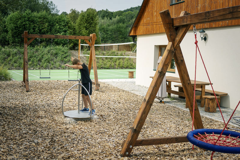 V bezprostřední blízkosti chalupy se nachází dětské hřiště vybavené houpačkami, kolotočem a pískovištěm. Pro míčové hry lze využít multifunkční hřiště. S dětmi si můžete zasoutěžit například ve vybíjené, nebo si postavit na terase mobilní stolní tenis.